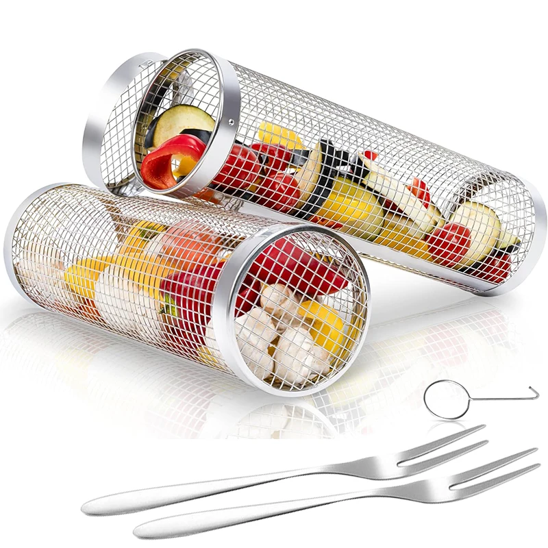 New Rolling Grilling BBQ Basket Stainless Steel Leakproof Mesh Barbecue Rack Outdoor Picnic Camping Simple Cylindrical BBQ Grill
